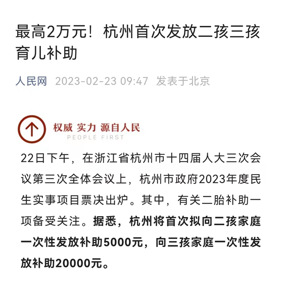 一次性发放:2023年2月22日,杭州官宣今年将首次向同一对夫妻生育二孩、三孩,且新出生子女户籍登记在杭州的家庭发放育儿补助,拟向二孩家庭一次性发放补助5000元,向三孩家庭一次性发放补助20000元。