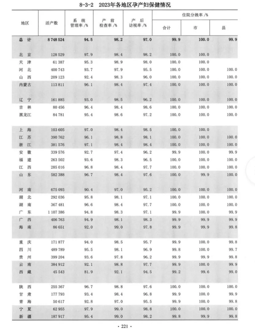 每年的《中国卫生健康统计年鉴》均列出上一年的全国和各省份的活产数据。例如,根据《2023中国卫生健康统计年鉴》,2022年全国活产数为959万人(四舍五入取整数),住院分娩率达到99.9%;而根据国家统计局公布的数据,2022年全国出生人口为956万人。可见,国家统计局公布的出生人口数与国家卫健委公布的活产数相差不大。