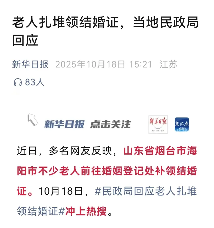 提出这个问题的网友,是因为看了这篇报道:10月18日《新华日报》报道:多名网友反映,山东省烟台市海阳市不少老人前往婚姻登记处补领结婚证。10月17日,记者联系到一位知情人士。他表示,10月14日,他们村的村委会称,接到了民政局的通知,让1950年5月1日至1997年9月1日区间的结婚登记人员补办结婚证,“此后某天,我们村统一包车,统一去办理。”他说,村里老人接到通知后就会按要求去办理,“有些人以前都登记结婚,结婚证遗失了,所以补办一下。有的是补领结婚证。”