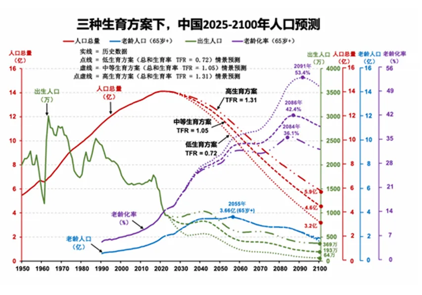 在中等生育方案情景下(TFR=1.05),到2100 年中国人口将降至 4.6 亿。