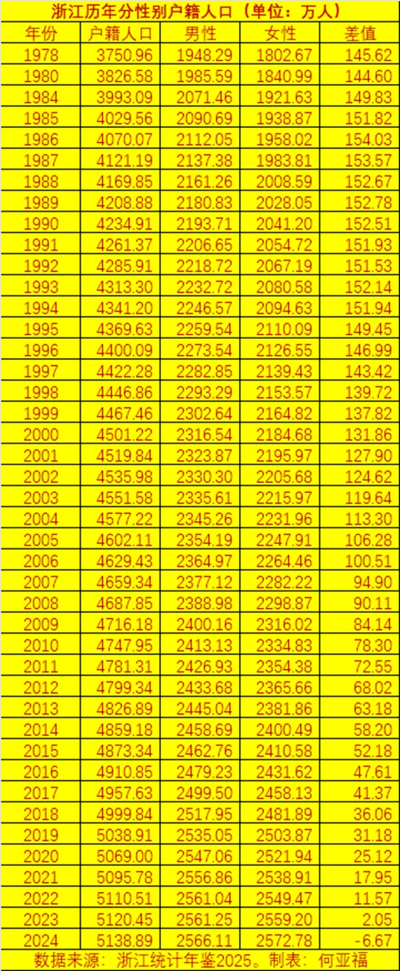 最新出版的《浙江统计年鉴2025》显示:2024年底,浙江省户籍人口共有5138.89万人,其中男性人口有2566.11万人,女性人口有2572.78万人。可见,女性数量比男性多6.67万人。