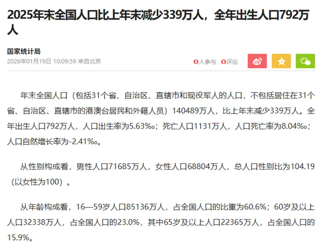1月19日,国家统计局公布2025年全国人口数据如下:2025年末全国人口140489万人,比上年末减少339万人。全年出生人口792万人,人口出生率为5.63‰;死亡人口1131万人,人口死亡率为8.04‰;人口自然增长率为-2.41‰。从性别构成看,男性人口71685万人,女性人口68804万人,总人口性别比为104.19(以女性为100)。从年龄构成看,16—59岁人口85136万人,占全国人口的比重为60.6%;60岁及以上人口32338万人,占全国人口的23.0%,其中65岁及以上人口22365万人,占全国人口的15.9%。