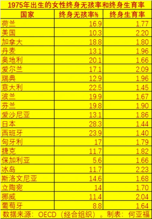 下表是OECD(经合组织)发布的1975年出生的女性的终身无孩率和终身生育率,这是2024年的数据。1975年出生的女性到2024年是49岁,所以,49岁时没有孩子,可以视为终身无孩。