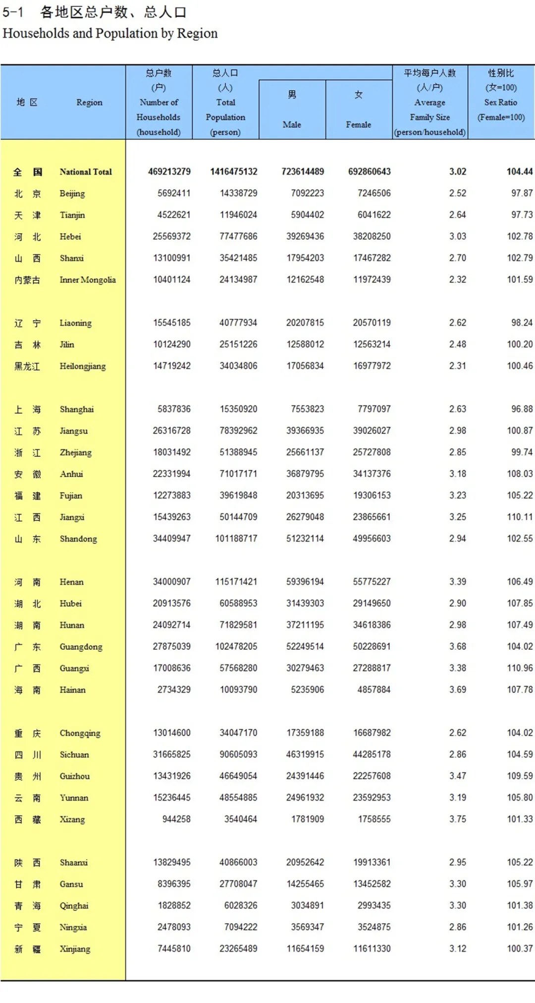 《中国人口和就业统计年鉴2025》表5-1显示,截至2024年底,中国总户数为469213279户(约46921万户),户籍总人口为1416475132人(约141648万人),平均每户3.02人。