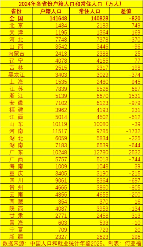 下表列出了2024年全国和各省份户籍人口与常住人口的比较(单位是万人):