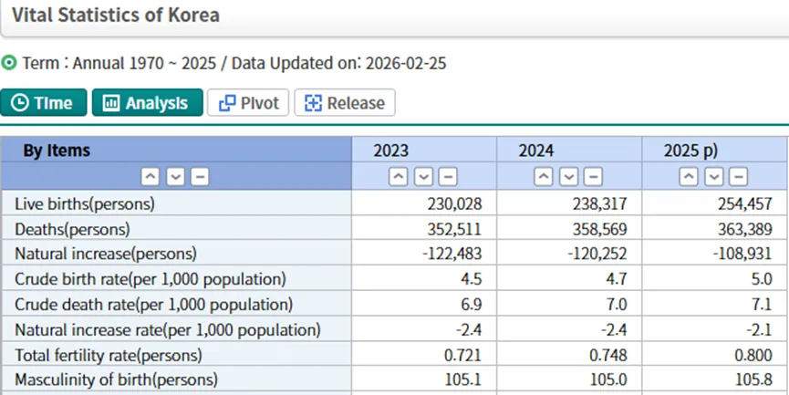 尽管韩国出生人口连续两年增长,但仍未扭转总人口自然减少的局面。2025年韩国总人口自然减少10.9万人。相比之下,2024年韩国总人口自然减少12万人,2023年自然减少12.2万人。