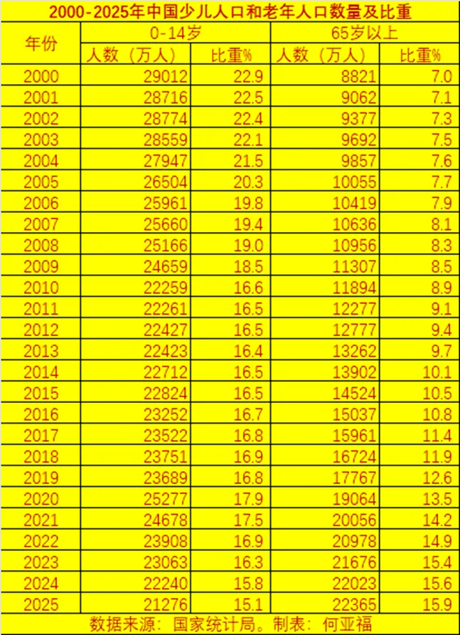 下表是2000-2025年中国0-14岁少儿人口和65岁以上老年人口的数量及比重,2025年的数据来源是国家统计局发布的《2025年国民经济和社会发展统计公报》,其余年份的数据来源是《中国统计年鉴2025》。