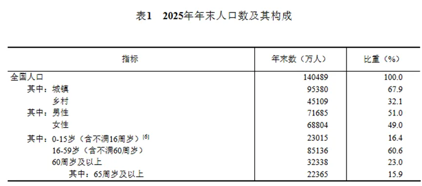 虽然65岁以上老年人口尚未超过0-15岁少儿人口,但上述统计公报在注释【6】有如下数据:2025年末,0-14岁(含不满15周岁)人口为21276万人,15-59岁(含不满60周岁)人口为86875万人。由此可以计算得:2025年末,0-14岁少儿人口比重为15.1%.