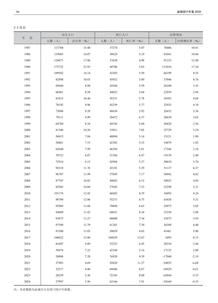 下面的截图是《盐城统计年鉴2025》表3-3,列出了2024年盐城市各区、县和县级市的人口变动情况:
