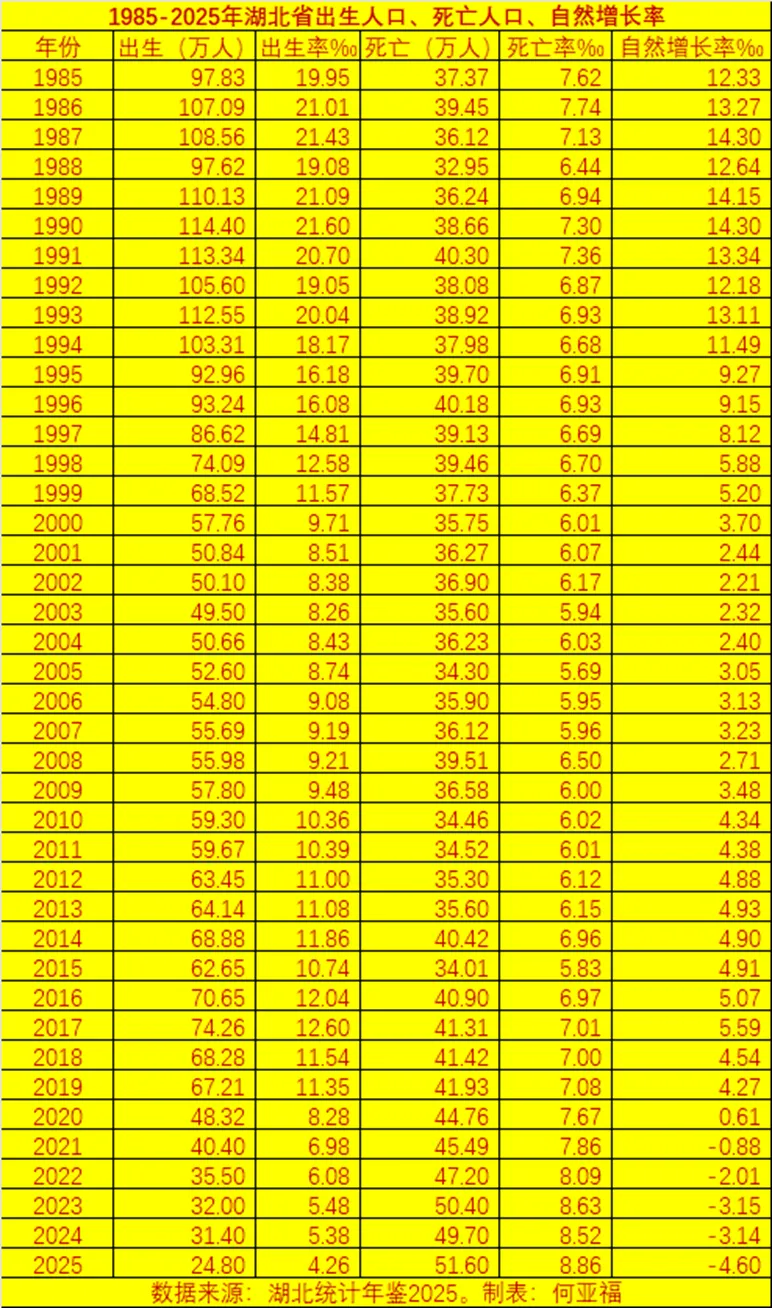 下表是1985-2025年湖北省出生人口、死亡人口、自然增长率,2025年的数据来源是统计公报,其余年份的数据来源是《湖北统计年鉴2025》。