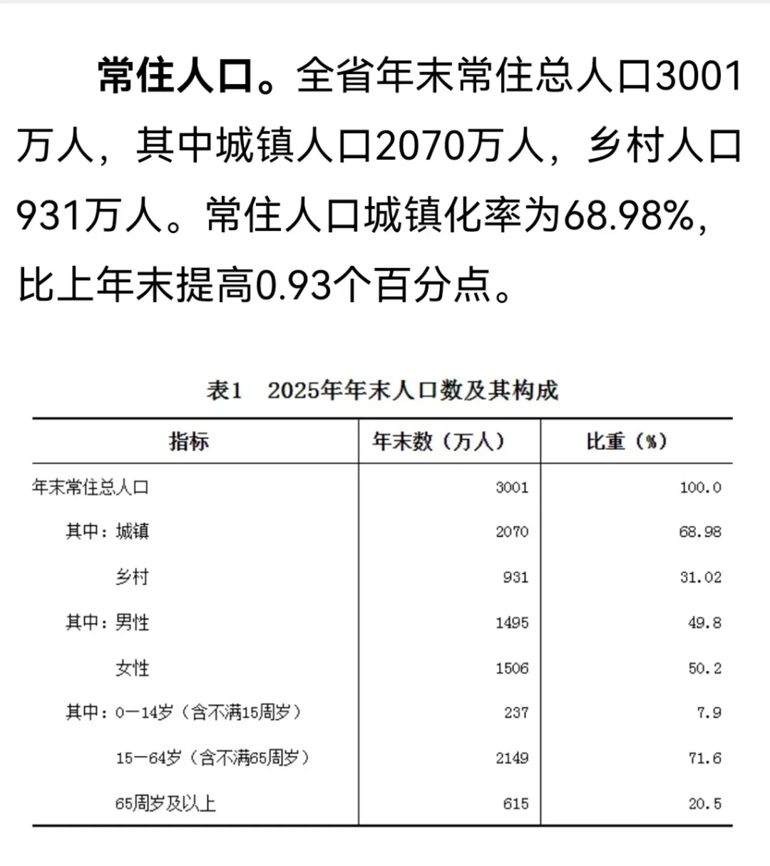 《2025年黑龙江省国民经济和社会发展统计公报》显示:常住人口。全省年末常住总人口3001万人,其中城镇人口2070万人,乡村人口931万人。常住人口城镇化率为68.98%,比上年末提高0.93个百分点。并附表1《2025年年末人口数及其构成》(见上面的截图)。