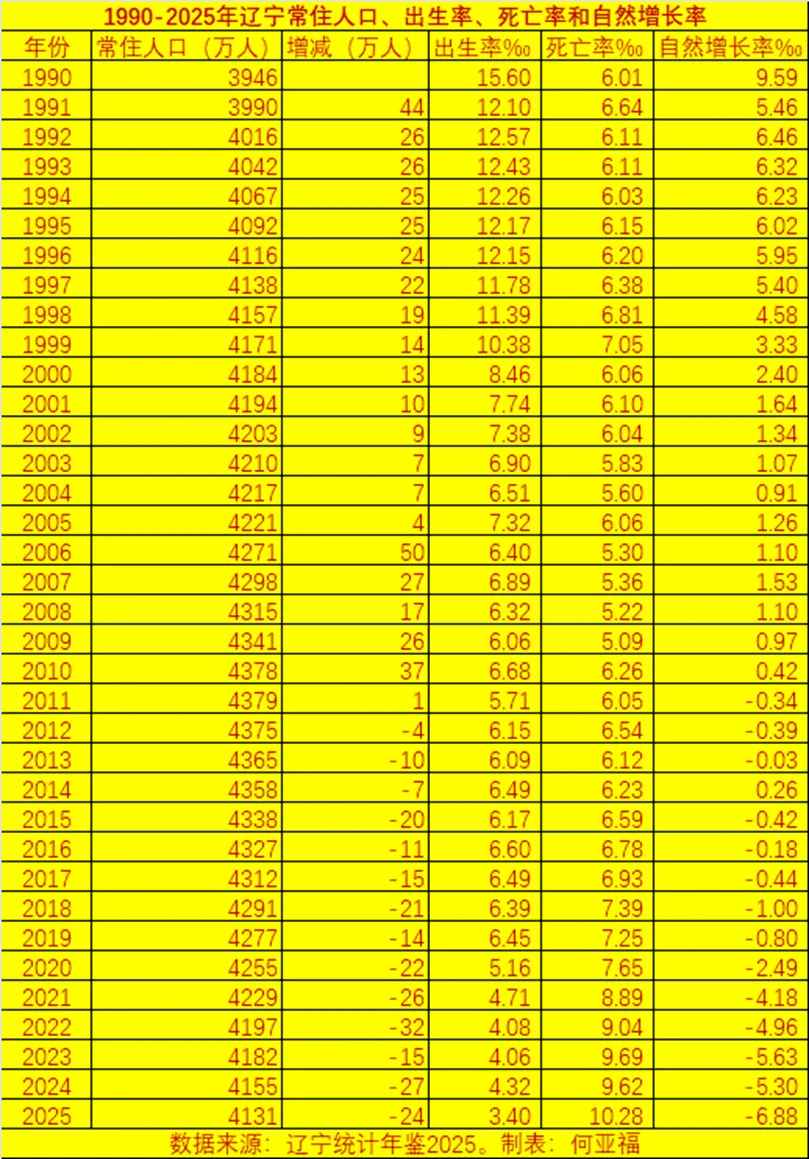 下表是辽宁1990-2025年辽宁常住人口、出生率、死亡率和自然增长率,表中的人口增减(单位万人)是指与上一年相比。2025年的数据来源是统计公报,其余年份的数据来源是《辽宁统计年鉴2025》。