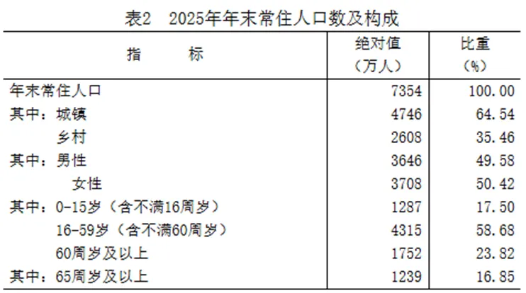 4月13日,河北省统计局发布《河北省2025年国民经济和社会发展统计公报》显示,2025年末常住人口7354万人,比上年末减少24万人。常住人口城镇化率为64.54%,比上年末提高1.12个百分点。全年出生人口36万人,出生率为4.89‰;死亡人口63万人,死亡率为8.48‰;人口自然增长率为-3.59‰。扣除自然增长,净流入3万人。并附表2《2025年年末常住人口数及构成》。