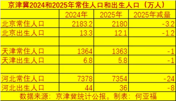 北京、天津、河北2024和2025年常住人口和出生人口见下表,表中的人口单位均为万人。