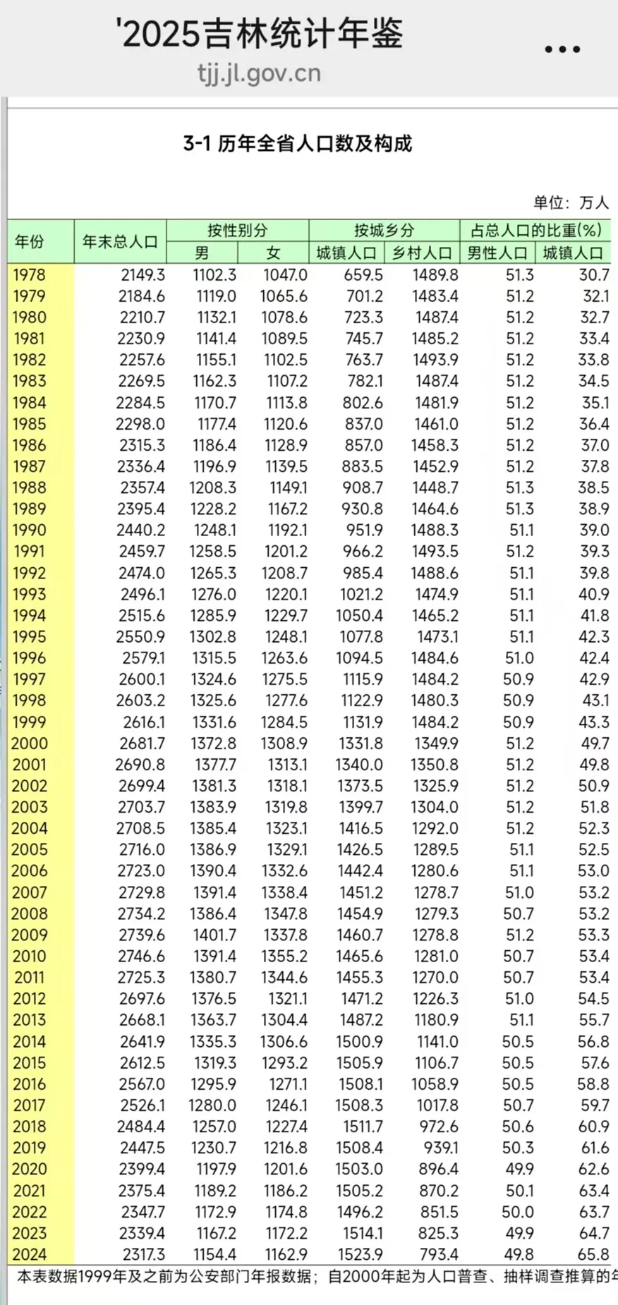下表是《2025吉林统计年鉴》表3-1《历年全省人口数及构成》。