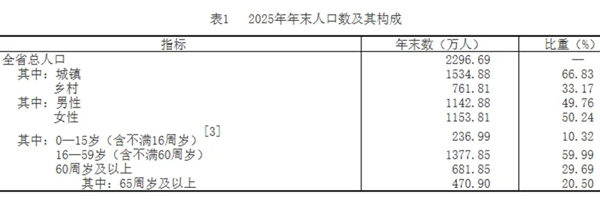 4月27日,吉林省统计局发布《吉林省2025年国民经济和社会发展统计公报》显示,2025年末全省总人口为2296.69万人,其中,城镇常住人口1534.88万人,占总人口比重(常住人口城镇化率)为66.83%,比上年末提高1.07个百分点。全年出生人口7.10万人,出生率为3.08‰;死亡人口21.80万人,死亡率为9.45‰;自然增长率为-6.37‰。人口性别比为99.05(以女性为100)。并附表1《2025年年末人口数及其构成》(见上面的截图)